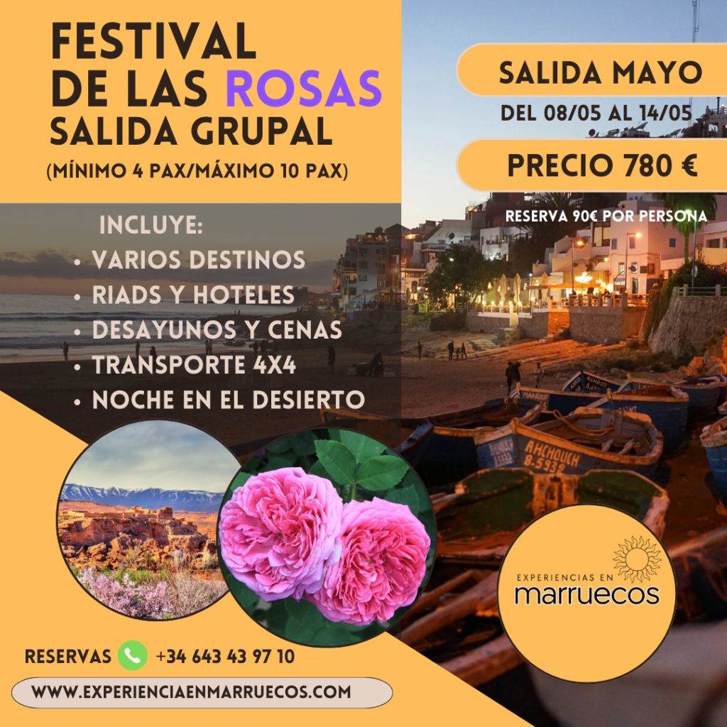 El Festival de las Rosas en Marruecos es una época del año en la que se recogen flores de damasco para elaborar un elixir de rosas que se usa principalmente para productos de estética. Se venden de todo tipo de productos, desde jabones a mermeladas, agua de rosas, cremas y perfumes. El valle está en el pueblo de Kelaa M’Gouna y se celebra en el segundo fin de semana de mayo. Todo el recorrido se llena de color y de su olor que hará las delicias de los asistentes.
